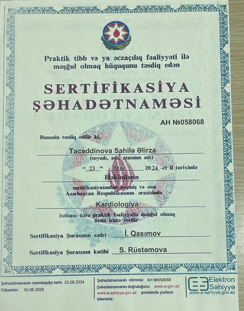 Kardioloq Sahilə Tacəddinova ürək və damar sistemi xəstəliklərinin diaqnostika və müalicəsi üzrə ixtisaslaşmış həkim mütəxəssisdir